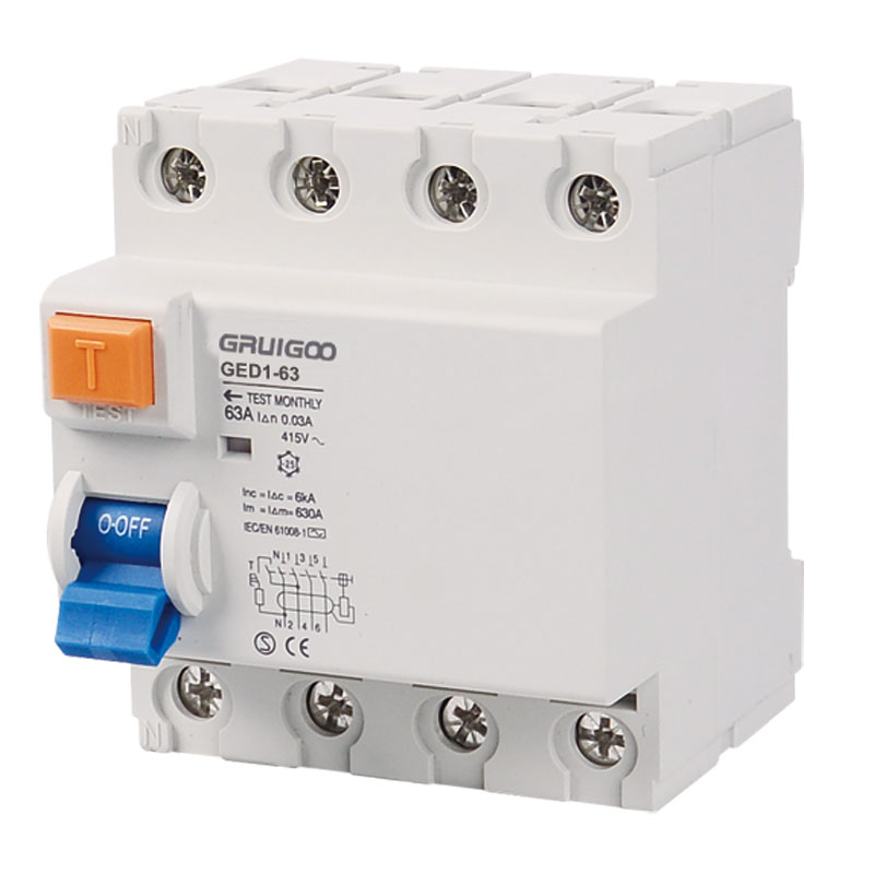 GED1系列剩余电流动作断路器( 不带过电流保护) 适用于交流50Hz,额定电压两极240V,四极415V,额定电流至63A 线路中,当人身触电或电网泄漏电流超过规定值时,剩余电流动作断路器能在极短的时间内迅速切断故障电源,保护人身及用电设备的安全,亦可作为线路的不频繁转换之用。