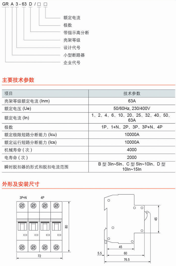 GRA3-63D带指示高分断小型断路器(以下简称断路器)是本公司在消化吸收国际先 进技术的基础上自行开发的新型产品。该产品性能可靠,保护特性精确,分类能力高,体积 小,是目前的最新型产品。