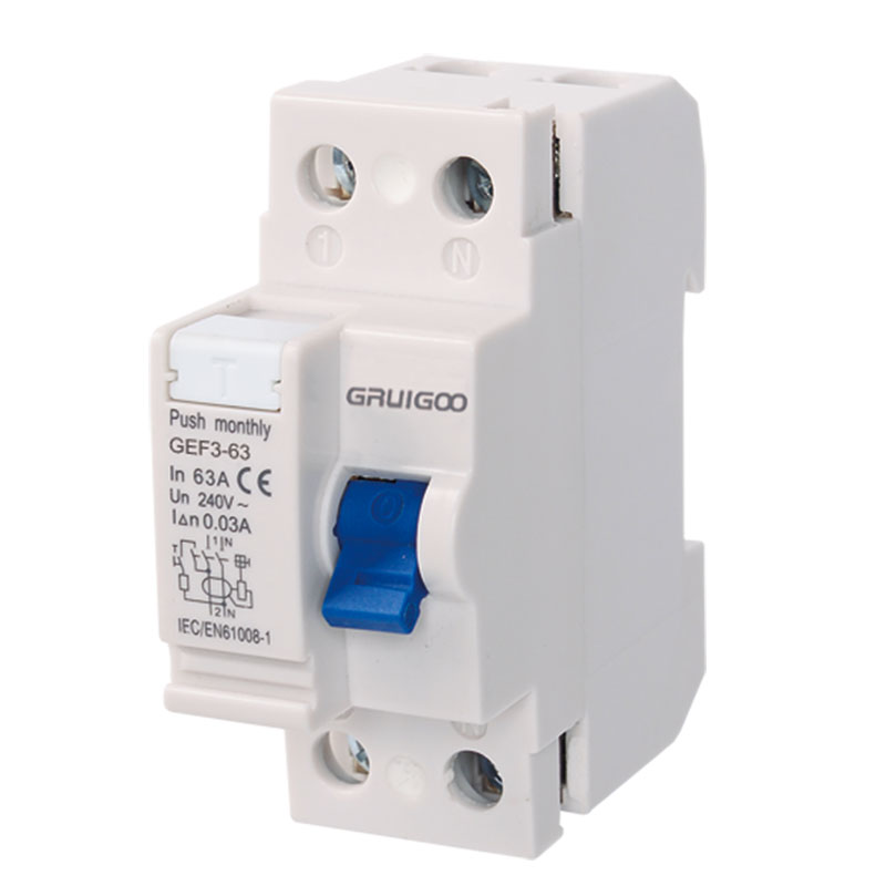 GEF3系列剩余电流动作断路器( 不带过电流保护) 适用于交流50Hz,额定电压两极240V,四极415V,额定电流至63A 线路中,当人身触电或电网泄漏电流超过规定值时,剩余电流动作断路器能在极短的时间内迅速切断故障电源,保护人身及用电设备的安全,亦可作为线路的不频繁转换之用。